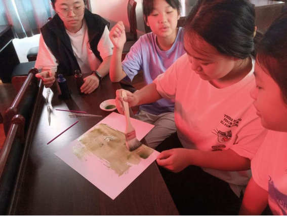 下午,实践队带领着小朋友领略科学的魅力,实践队指导小朋友们完成了“蓝晒”小实验,去捕捉光的影子。小朋们了解蓝晒的原理后,便去采摘不同形状植物来作为实验的原料,经太阳晒过、水洗过后,画纸上留下了植物的形状,甚至可以观察到树叶的脉络,小朋友们看着原来一片蓝的画纸变成了有着植物剪影的神奇画作,不禁感到十分神奇,都对自己的画作爱不释手。