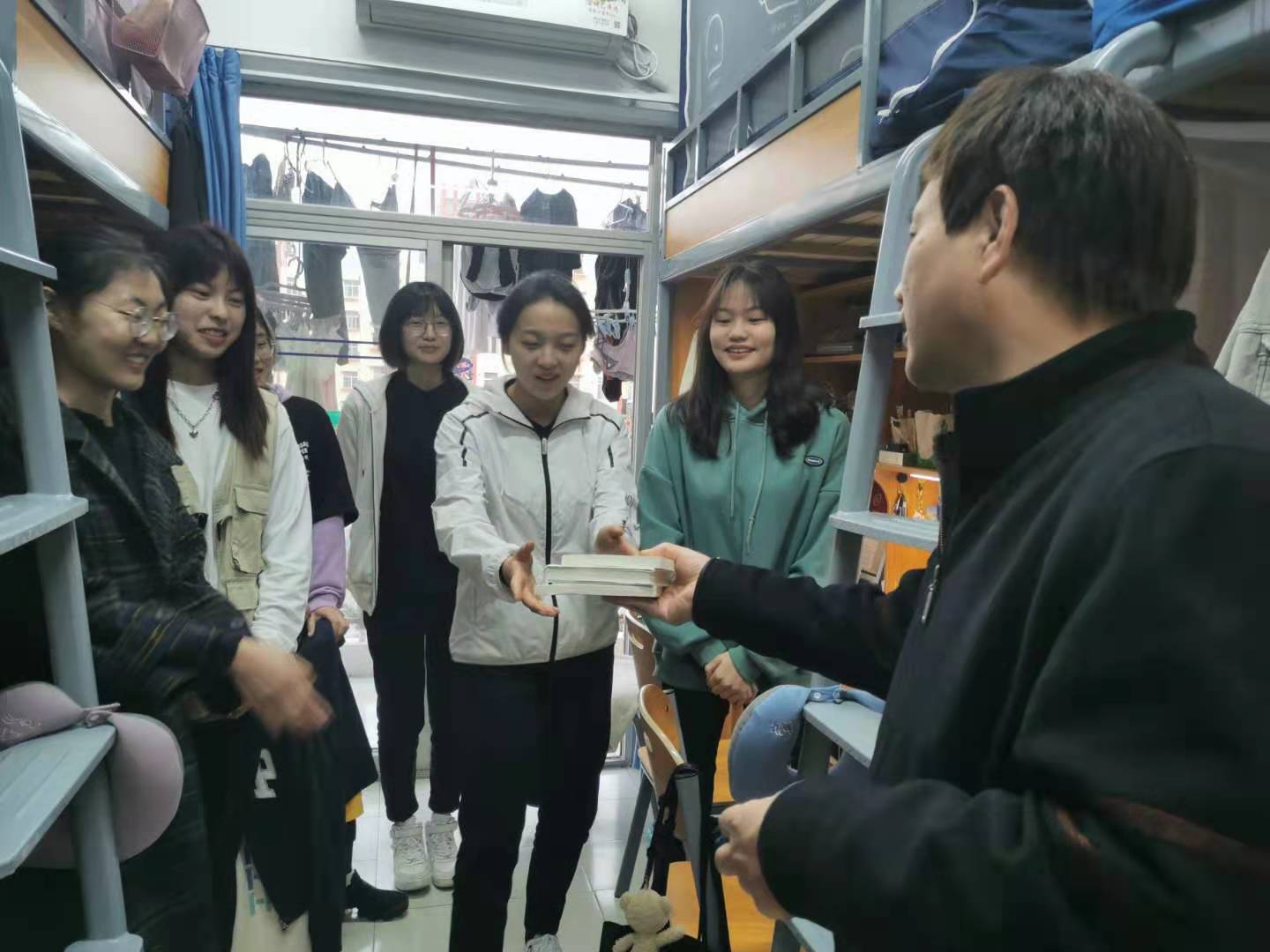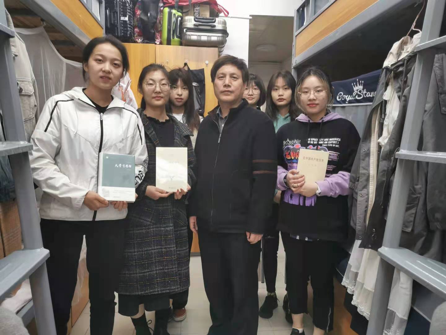 在交谈中,杨书记对同学们送去了生活上的关怀,询问同学们的家乡以及考研想法,勉励大家朝着更优秀的目标前进。其次谈到了党员学生干部的职责定位,告诫同学们要珍惜为人民群众服务的宝贵机会,起到党员学生干部的先锋模范作用。杨书记还提到,在学习工作之余,要注意劳逸结合,养成良好作息习惯,加强体育锻炼、增强体质,做到全面发展。在最后,杨书记向同学们送去了《大学有精神》、《大学的人文教育》、《论中国共产党历史》三本书,鼓励同学们多学党史,牢记使命,继承和发扬爱国主义精神。